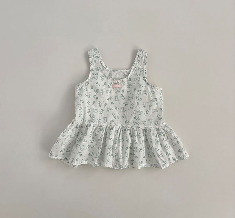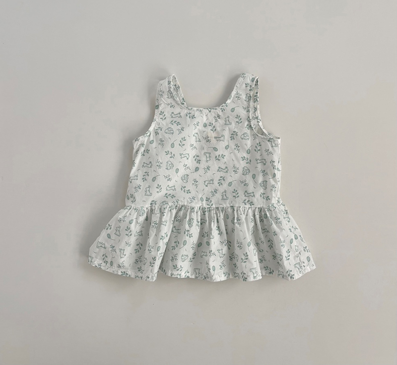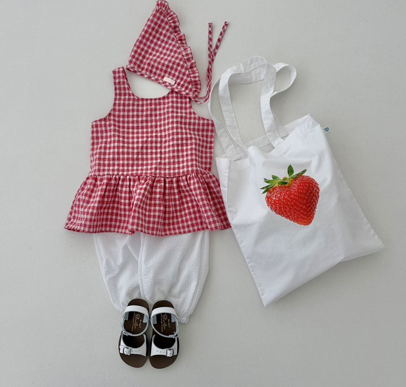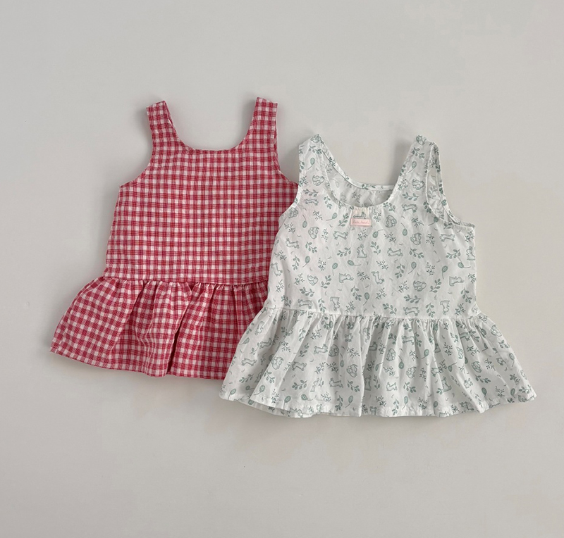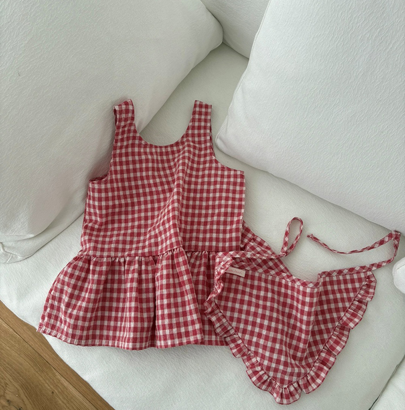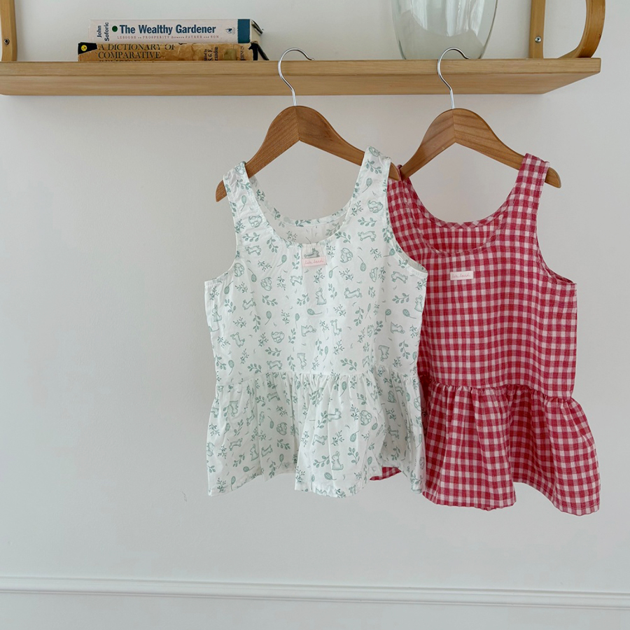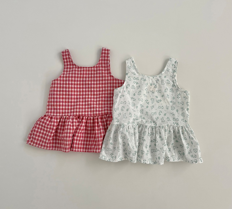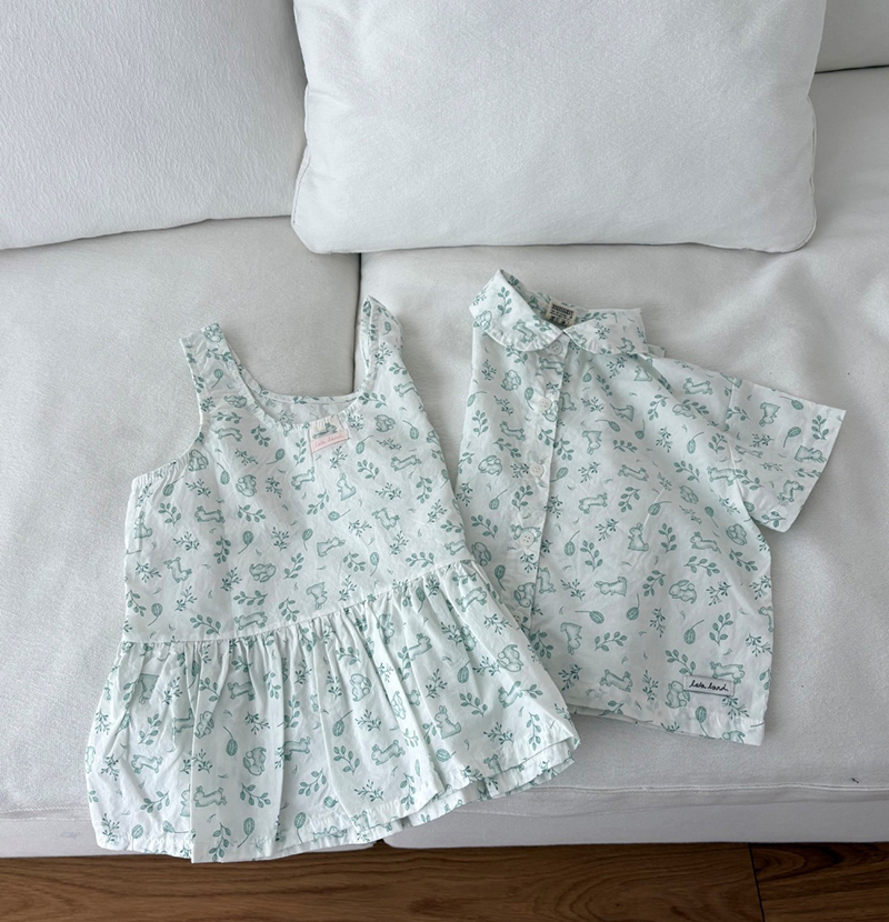 깅엄체크와 더불어 아이보리 컬러의 귀여운 나뭇잎과 토끼 프린트가